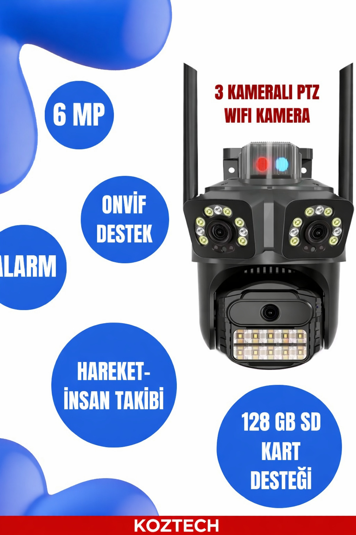 6MP 3 KAMERALI PTZ WIFI KAMERA UYGULAMA: ICSEE, 6MP ÇÖZÜNÜRLÜK, 2 SABİT 1 PTZ OLMAK ÜZERE 3 KAMERA, ONVİF DESTEĞİ, HAREKET TAKİBİ, İNSAN TAKİBİ, ÇİFT YÖNLÜ SES, ALARM, ÇAKAR LAMBA, RENKLİ GECE GÖRÜŞÜ, 128GB SD KART DESTEĞİ, UYGULAMAYA FOTOĞRAFLI BİLDİRİM