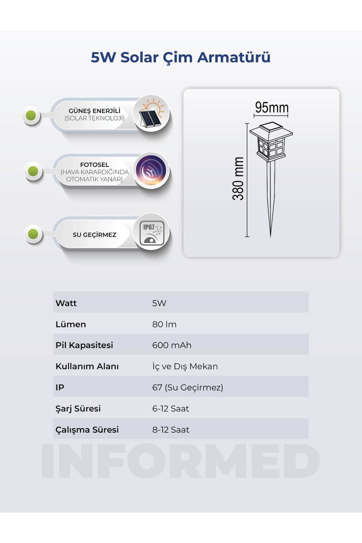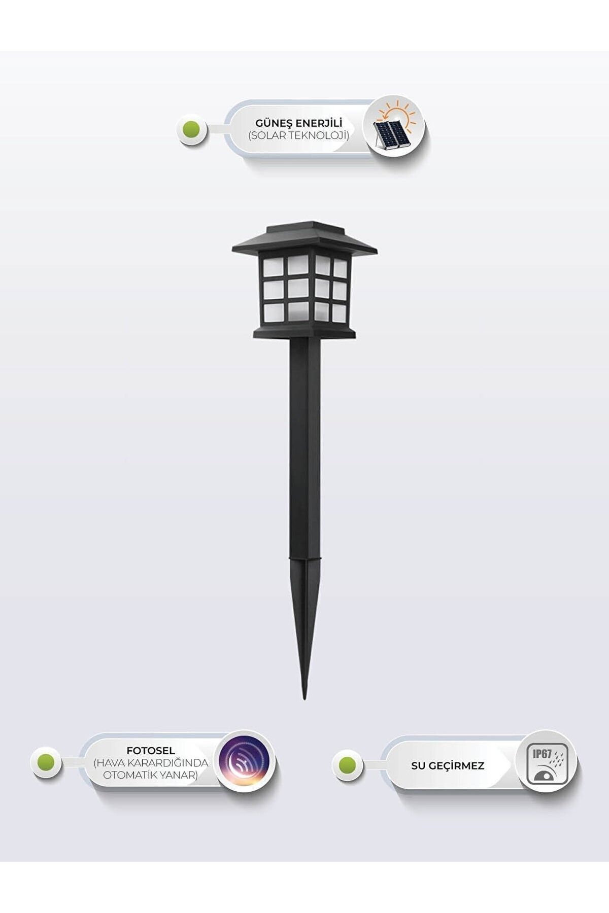 Kullanım: ÜRÜNÜN PANELİNİN BULUNDUĞU ŞAPKA KISMINI SAAT YÖNÜNÜNÜ TERSİNE ÇEVİREREK AÇINIZ, AÇMA KAPAMA DÜĞMESİNİ AÇIK KONUMA GETİRİNİZ, SONRA TEKRAR BİRLEŞTİRİNİZ. ; SABİTLEME APARATLARI İLE GÜNEŞİ TAM OLARAK ALACAĞI BİR NOKTAYA SABİTLEYİNİZ. ; ÜRÜNÜNÜZ KULLANIMA HAZIRDIR. ; GÜNDÜZ ŞARJ OLUR HAVA KARARDIĞINDA İSE AYDINLATIR. ; ÜRÜNÜMÜZ GÜN IŞIĞI RENGİNDE BAHÇE İÇERİSİNDE BULUNAN PATİKA YOLLARIN ETRAFINDA, BAHÇE İÇERİSİNDE DEKORATİF AMAÇLI KULLANILAN BİR AYDINLATMA ARMATÜRÜDÜR. ; ÜZERİNDE BULUNAN SOLAR PANEL SAYESİNDE GÜN IŞIĞINDA VE GÜNEŞ ENERJİSİ İLE ŞARJ OLMAKTA, GÜNEŞ BATTIĞINDA DA ÇALIŞMAYA BAŞLAR. ; IP 65 SERTİFİKASINA SAHİP ÜRÜNÜMÜZ DIŞ İKLİM ŞARTLARINDAN ETKİLENMEYECEK ŞEKİLDE TASARLANMIŞTIR. ; PAKET İÇERİSİNDEN ÇIKAN ÜRÜNÜN TOPRAĞA SAPLANAN KISMINDAN TUTUP ÜSTÜNÜ ÇEVİREREK BAŞLIK ÇIKARTILIR, POVER TUŞU ON KONUMUNA ALINDIKTAN SONRA ÇALIŞMAYA BAŞLAYACAKTIR. ; GÜN IŞIĞINDA SÖNEREK ŞAR OLUR HAVA KARARDIĞINDA DA IŞIĞI YANAR. ; DEMONTE OLARAK GÖNDERİLMEKTEDİR. ; TOPRAĞA SAPLANAN KAZIĞI GÖVDESİNE GÖVDESİNİ DE BAŞLIĞINA KOLAYCA TAKARAK KULANILMAYA BAŞLANABİLİR…;